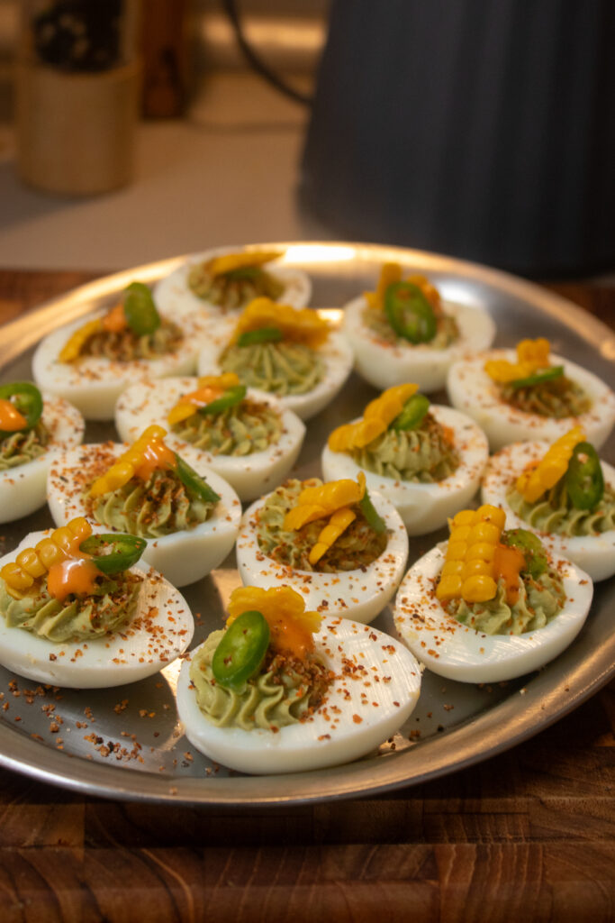 This easy deviled eggs recipe is a modern twist on the classic version, but it still has a little kick. Deviled eggs are traditionally made with mayonnaise, mustard and salt. For this recipe, I decided to give it a Mexican twist. I therefore used avocado, Tajín, lime juice, jalapeños and corn. You probably know Tajín, but in case you don’t, Tajín is a popular Mexican seasoning blend made from chili peppers, dehydrated lime juice and sea salt. If you can’t find Tajín, then use chili flakes and chop or grind them a bit smaller.