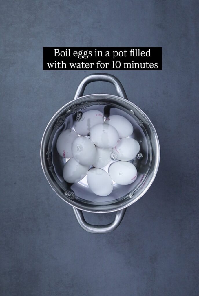 - Boil the eggs in a cooking pot filled with water for 10 minutes.