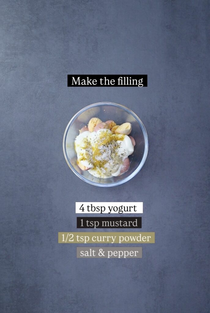 - Add yogurt and mustard to the egg yolks. Season with curry powder, salt, and pepper, and mash with a fork.