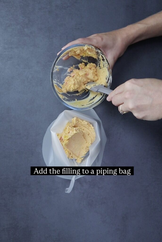 - Transfer the egg mixture to a piping bag and stuff the eggs with the filling.