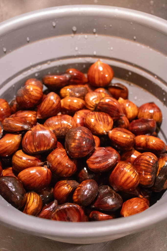 - Boil water. Add the chestnuts to a heat-resistant bowl. Cover them with the boiled water and let them rest for 1 to 1 1/2 hours.